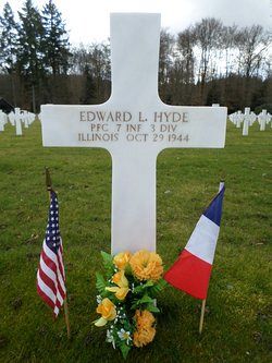 Pfc Edward L. Hyde was killed by small arms fire in the thorax.Source of information: Leo Minne, www.abmc.gov, www.wwiimemorial.com, www.ancestry.com – 1930/1940 Census / U.S. Headstone and Interment Record / U.S. Draft Cards Young Men / US WW2 Hospital Admission Cards, History 3rd Infantry Division WWII