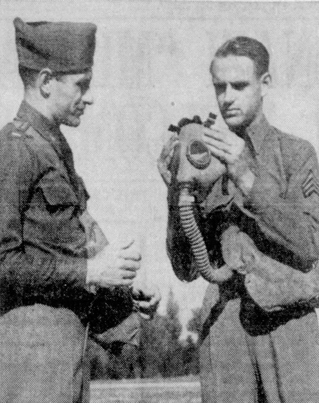1st Lt Alton R. Kalkwarf graduated from Reitz High School and was attending Lockyear’s Business College before he joined the National Guard in Evansville, Indiana on 17 January 1941. He was sent overseas in September 1944.On one photo Lt Hartford Salee shows Lt Alton Kalkwarf (on the left) the proper way to put on a gas mask.