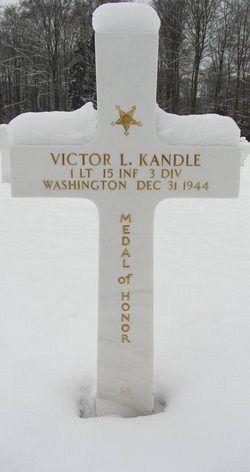 Victor L. Kandle worked in a factory for bakery products before he joined the Regular Army at Fort Lawton, Washington on 5 September 1940.He was awarded the Medal of Honor posthumously for his action on 9 October 1944. The citation cited: On 9 October 1944, at about noon, near La Forge, France, 1st Lt Kandle, while leading a reconnaissance patrol into enemy territory, engaged in a duel at point blank range with a German field officer and killed him. Having already taken five enemy prisoners that morning, he led a skeleton platoon of 16 men, reinforced with a light machinegun squad, through fog and over precipitous mountain terrain to fall on the rear of a German quarry stronghold which had checked the advance of an infantry battalion for two days. Rushing forward, several yards ahead of his assault elements, 1st Lt Kandle fought his way into the heart of the enemy strongpoint, and, by his boldness and audacity, forced the Germans to surrender. Harassed by machinegun fire from a position which he had bypassed in the dense fog, he moved to within 15 yards of the enemy, killed a German machine gunner with accurate rifle fire and led his men in the destruction of another machinegun crew and its rifle security elements. Finally, he led his small force against a fortified house held by two German officers and 30 enlisted men. After establishing a base of fire, he rushed forward alone through an open clearing in full view of the enemy, smashed through a barricaded door, and forced all 32 Germans to surrender. His intrepidity and bold leadership resulted in the capture or killing of three enemy officers and 54 enlisted men, the destruction of three enemy strongpoints, and the seizure of enemy positions which had halted a battalion attack.