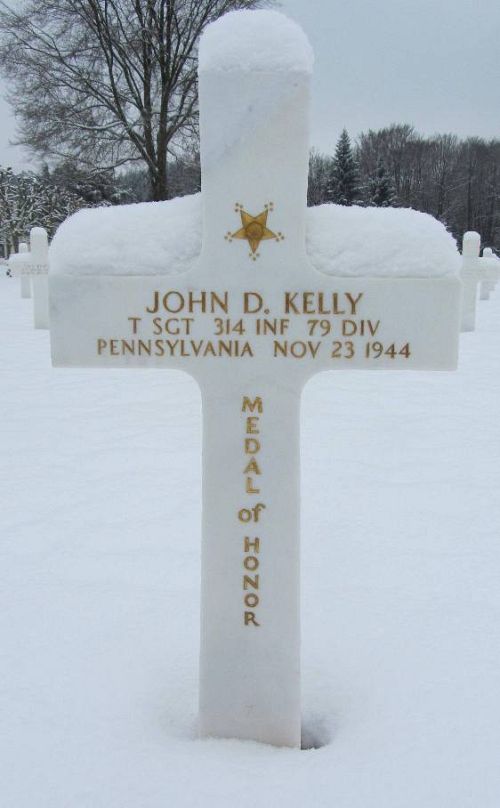 He was awarded the Medal of Honor posthumously on 24 January 1945 for his actions on 25 June 1944, near Fort du Roule, Cherbourg, France. The citation cited: On 25 June 1944, in the vicinity of Fort de Roule, Cherbourg, France, when Cpl Kelly's unit was pinned down by heavy enemy machinegun fire emanating from a deeply entrenched strongpoint on the slope leading up to the fort, Cpl Kelly volunteered to attempt to neutralize the strongpoint. Arming himself with a pole charge about ten feet long and with 15 pounds of explosive affixed, he climbed the slope under a withering blast of machinegun fire and placed the charge at the strongpoint's base. The subsequent blast was ineffective, and again, alone and unhesitatingly, he braved the slope to repeat the operation. The second blast blew off the ends of the enemy guns. Cpl Kelly then climbed the slope a third time to place a pole charge at the strongpoint's rear entrance. When this had been blown open he hurled hand grenades inside the position, forcing survivors of the enemy gun crews to come out and surrender. The gallantry, tenacity of purpose, and utter disregard for personal safety by Cpl Kelly were an incentive to his comrades and worthy of emulation by all.