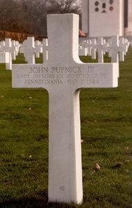 S/Sgt John Rupnick Jr. volunteered for the Air Corps of the Army of the United States in Pittsburgh, Pennsylvania on 28 October 1942.Immediately after the bombs were released, the airplane received a direct flak hit in the wing at #1 engine. A part of the wing was blown off the airplane went down in a flaming spin.