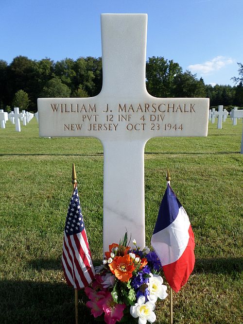 Pvt William J. Maarschalk attended high school for 4 years and was a bookkeeping machine operator before he joined the National Guard in Newark, New Jersey on 16 September 1940.He was first buried at the Temporary American Military Cemetery in Solers, France.