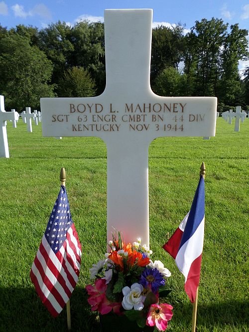 Sgt Boyd L. Mahoney was a routeman before he enlisted at Fort Benjamin Harrison, Indiana on 8 February 1943. He was sent overseas in August 1944.He was killed by artillery shell fragments to his hand.