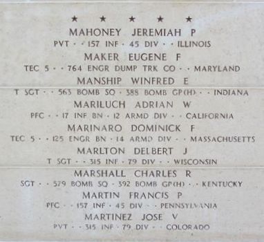 Pfc Francis P. Martin enlisted in Wilkes Barre, Pennsylvania on 7 December 1942.On 16 January 1945 Martin was on a truck convoy bringing rations to the front lines. The convoy was ambushed, and Martin was not among the men who escaped. Over the next few days, the Germans surrounded the 157th, preventing any search for Martin or the recovery of his body. With no evidence in captured German records that he survived the ambush or was held as a prisoner of war.