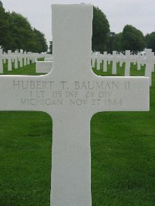 H. Thane Bauman II was cited for gallantry in action against the enemy in Germany. The citation read: “On November 27, 1944 during the attack on the strongly-held town of Kirchberg, Germany, Company “E” sustained heavy casualties including all officers with the exception of First Lieutenant Bauman, company commander. In desperate need of reinforcements, he was leading a platoon of Company “I” into position when they were ambushed by a strong enemy force. In the face of overwhelming odds he elected to fight rather than surrender his command and was killed in an effort to cover the withdrawal of his men. The courage and leadership displayed by Lieutenant Bauman in this action were of the highest order and reflect great credit upon himself and the military service.”