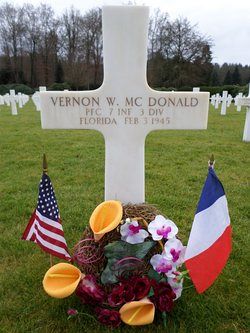 Pfc Vernon W. McDonald was employed by the Kuder Citrus Mill before he enlisted in May 1943.In October 1944, he was wounded in action in France by artillery shell fragments to his neck and knee. He stayed in the hospital until January 1945.