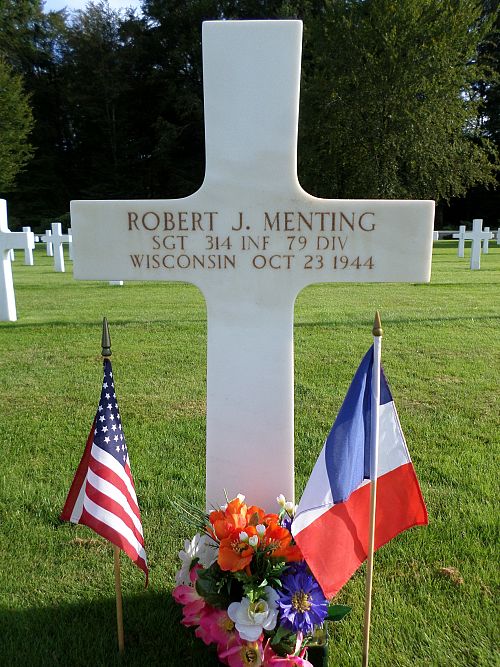 Sgt Robert J. Menting enlisted in 1942.His sister, Margaret M. Menting, recalled the following: “I remember Tom Duffy coming to our house and telling all the family what really happened to Robert. Tom lived in our area. He had been in the foxhole with Robert, and he still had shrapnel in much of his body. He said Robert’s unit was being pulled back for R & R and a new bunch from the 44th Infantry Division had come in. This 44th group was ordered to fire at the Germans but one shot was too low. It killed Robert and wounded Tom. A chaplain got them both out of the hole. Robert was hit in the back of the head. This meant the fire came from the American position.”