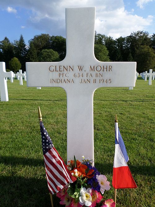 Pfc Glenn W. Mohr attended Ben Davis High School and was employed by the Crouse-Hinds Company before he enlisted at Fort Benjamin Harrison, Indiana on 26 August 1943. He was sent overseas in April 1944.He died 11 January 1945 in a hospital from wounds, suffered the same day.