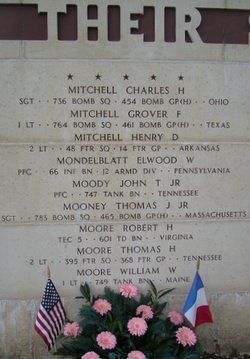 Pfc John T. Moody graduated from Hume-Fogg High School and was a salesman, employed by the Miles Motor Co. and the Tennessee Aircraft Inc. before he enlisted at Fort Oglethorpe, Georgia on 12 November 1943. He was sent overseas in October 1944.Source of information: Leo Minne, www.abmc.gov, www.wwiimemorial.com, www.ancestry.com - 1930/1940 Census / U.S. Headstone and Interment Record for U.S. Military Cemeteries on Foreign Soil / U.S. Draft Cards Young Men / U.S. WW2 Hospital Admission Cards / Crisler-Taylor Family Tree