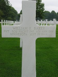Pvt William Elmer Baker volunteered for the Army of the United States on 21 February 1942. he first served as an instructor. On 8 November 1943 his request for transfer to the paratroopers was granted. He was sent to France in May 1944.Pvt Baker was initially buried at the temporary American Military Cemetery of Son, The Netherlands.