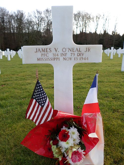 Pfc James V. O'Neal Jr. attended high school for one year and was telephone operator for Illinois Central Railroad.He enlisted at Camp Shelby, Mississippi on 7 May 1943.