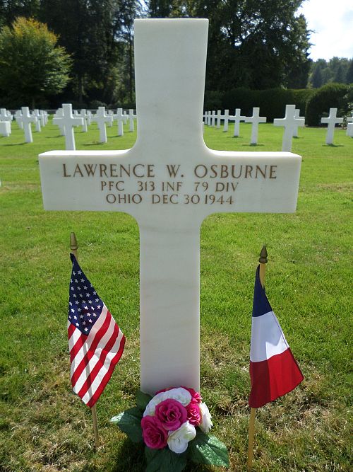 Pfc Lawrence W. Osburne was employed at the Follansbee Steel Corporation before he enlisted at Fort Thomas, Kentucky on 25 March 1944.He was killed by artillery shell fragments in his stomach and thigh.