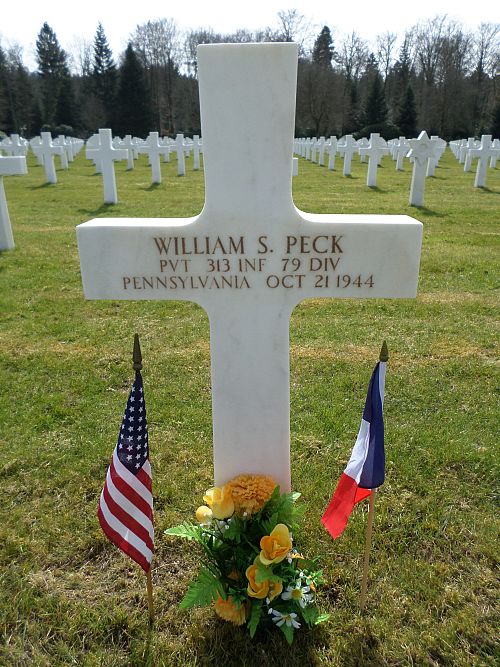 Pvt William S. Peck attended Quincy High School for three years and was employed at the Landis Tool Company before he enlisted in Indiantown Gap, Pennsylvania on 11 June 1943.He was killed by atillery shell fragments.