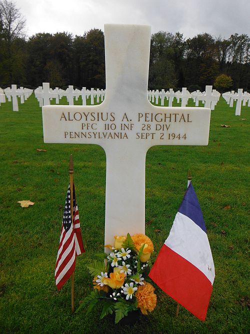 Pfc Aloysius A. Peightal joined the National Guard in Indiana, Pennsylvania, on 17 February 1941. He was sent overseas in October 1943.He was first buried at the Temporary American Military Cemetery in Solers, France.