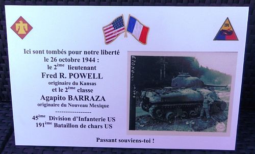 2nd Lt Fred R. Powell was a student at the University of Kansas when he enlisted on 21 February 1942.On 26 October 1944 in a wood in the vicinity of Housseras his tank was hit by an anti-tank shell, killing 2nd Lt Powel and Pvt Agapito Barraza, who is remembered on the wall of the missing at the Brittany American Cemetery in St. James, Normandy, France.