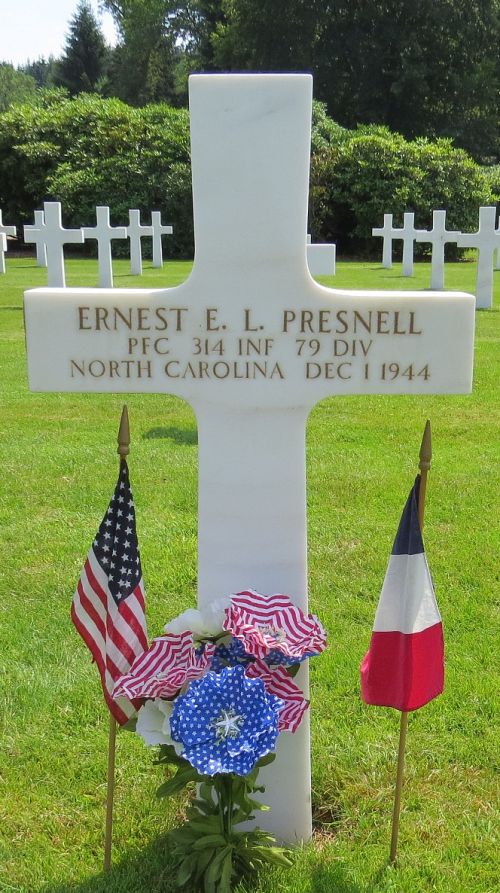 Pfc Ernest E. L. Presnell worked on a farm before he enlisted at Camp Croft, South Carolina on 16 June 1943. He was sent overseas in May 1944.He was killed by artillery shell fragments.