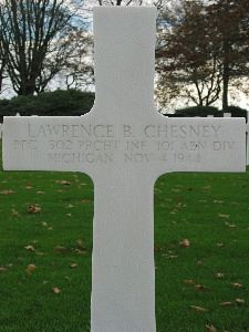 Pfc Lawrence B. Chesney enlisted in December 1942 and was sent overseas in June 1944. He took part in the D-Day invasion of France. He was reported missing at the beginning of the Netherlands campaign.Source of information: Terry Hirsch, http://www.ww2-airborne.us/, www.ancestry.com - Family Trees, WWII DRaft Cards, 1940 Census
