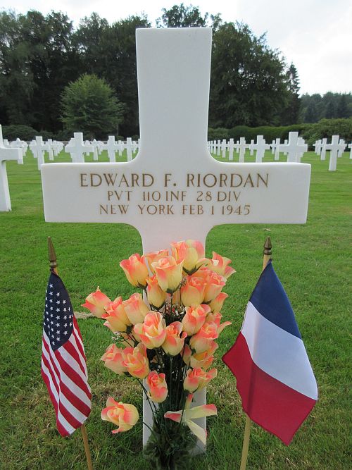 Pvt Edward F. Riordan attended East Bloomfield High School for three years and was a driver before he enlisted in Rochester, New York on 18 July 1944.Source of information: Peter Schouteten, www.abmc.gov, www.wwiimemorial.com, www.archives.gov - WWII Enlistment Record, www.ancestry.com - Headstone and Interment Record / New York State Birth Index / U.S. WWII Draft Cards Young Men / 1920 Census, www.findagrave.com, www.newspapers.com - Democrat and Chronicle 27 February 1945