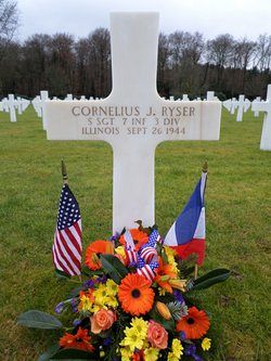 S/Sgt Cornelius J. Ryser attended high school for two years and was employed by the International Harvester Company before he enlisted in Chicago, Illinois on 31 August 1942.He was killed by artillery shell fragments in his leg.