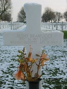 Pfc Aldo Bramucci enlisted in Springfield, Massachusetts on 12 May 1943.He was a chauffeur before he enlisted. He fought in Europe with the battle-hardened 1st Division, won the Bronze Star twice, the Purple Heart three times. He went ashore on D-Day on Omaha Beach and fought in the Hürtgen Forest, where his company lost half its men. Killed near Schierke, Germany, April 17, 1945, when caught in a German artillery barrage while returning to the front after helping to evacuate wounded comrades. His older brother, Pfc Ernest Bramucci, who met up with Aldo in a field hospital where both were being treated for wounds, wrote this eulogy: "I don't believe there is another man who deserves credit for a braver soldier than he was. He was wounded twice, and the third time was enough".
