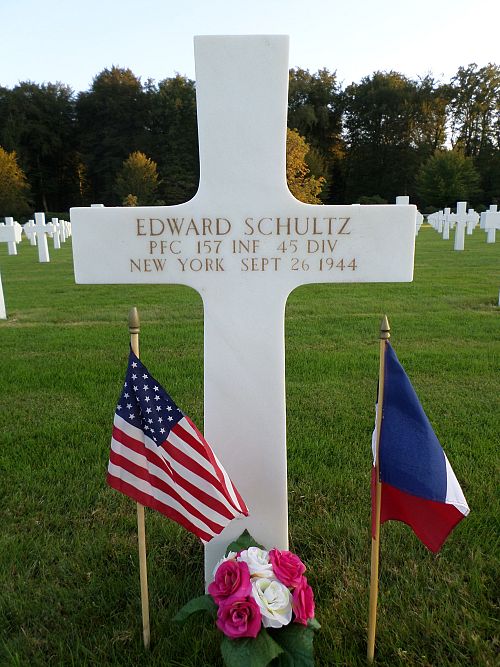 Pfc Edward Schultz attended high school for 3 years and was employed as a clerk for the Railway Mail Service.He enlisted in New York City, New York on 9 April 1943.