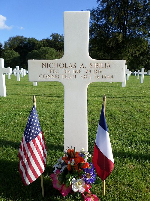 Pfc Nicholas A. Sibilia was employed at the Underwood Elliott Fisher Company before he enlisted in Hartford, Connecticut on 3 March 1943.He was killed by small arms fire in his chest and lung.