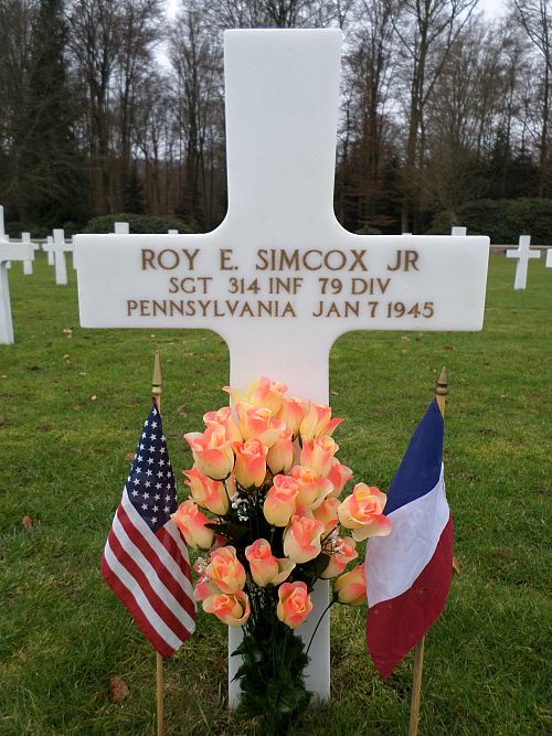 Sgt Roy E. Simcox Jr. was employed by the Piper Aircraft Corporation before he enlisted in Altoona, Pennsylvania on 22 June 1942. He was sent overseas in April 1944.He was struck by a fragment of an artillery shell as he and 15 other infantrymen were gathered in a hall after a night on the field.