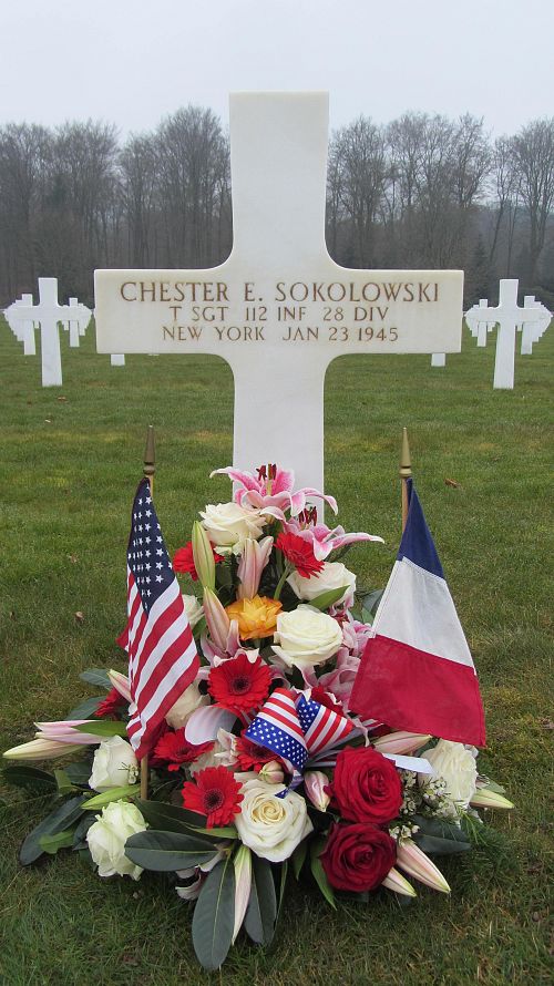 T/Sgt Chester E. Sokolowski graduated from St Francis High School in Athol Springs, New York. and was a machine operator at the Clark Brothers Company.He joined the National Guard in Olean, New York on 16 September 1940. He was sent overseas in November 1944.