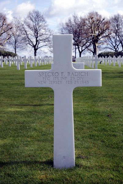 Pfc Srecko Radich and his family came to the United States in 1927 and first lived in Manhattan, New York City.He enlisted on 12 May 1944 at Fort Dix, New York. He joined his unit from a Replacement Depot on 30 November 1944 and was promoted to Private First Class on 1 January 1945. He was killed three days before his 25th birthday.