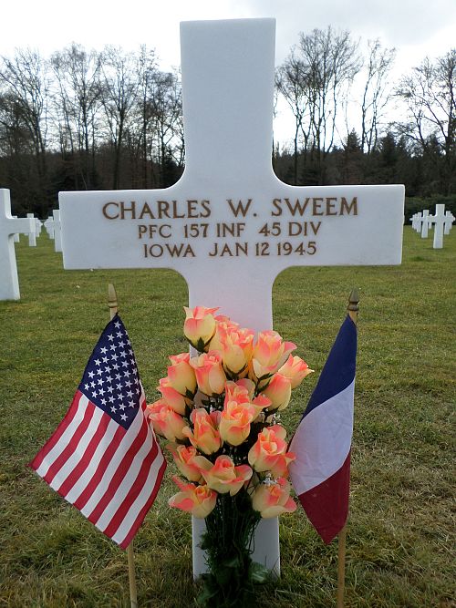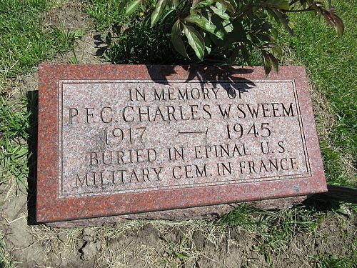 Pfc Charles W. Sweem was a driver before he enlisted in Camp Dodge, Iowa on 5 June 1944.He is remembered at the Gullion Cemetery in Attica, Marion County, Iowa.
