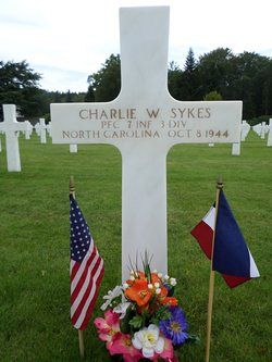 Pfc Charlie W. Sykes attended high school for one year and was a production worker, employed by the North Carolina Pulp Company.He enlisted at Fort Bragg, North Carolina on 25 November 1942.