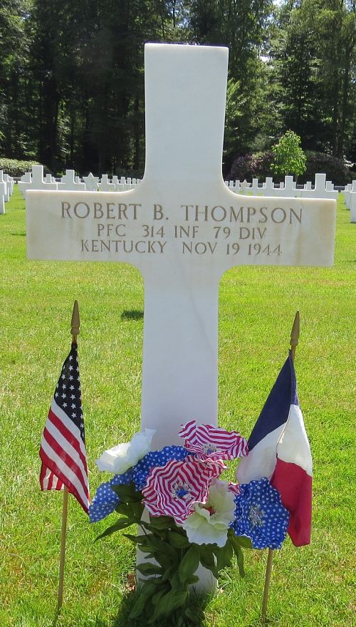 Pfc Robert B. Thompson attended high school for one year and was a driver before he enlisted in Cincinnati, Ohio on 30 March 1943.He was killed by artillery shell fragments to his spine, trunk, and gallbladder.