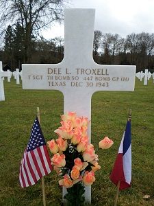 Dee Troxell attended college before he volunteered for the Air Corps of the Army of the United States in Lubbock, Texas on 5 December 1942.On returning, the aircraft was shot down by a Me 110, left formation with the #1 engine smoking, and crashed near Coudray Farm at Berville.