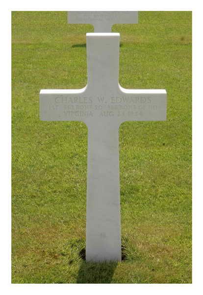 Lt. Charles W. Edwards graduated from Virginia Polytechnic Institute with the Class of 1941. Prior to entering the Army Air Corps In Washington, D.C., he was working as a locomotive engineer.Bombs were away at 1246 hours. Strike photos show excellent results for the A Group with a tight pattern covering the MPI. Most of the B Group bombs fell short of the Target. The C Group reported "good strikes" but no photos were taken on their bombing. The target was bombed visually in CAVU weather. Heavy accurate flak was encountered at the Target and one of our a/c was lost due to this. Meager flak was encountered at Heligoland. 4 a/c had major damage and 19 a/c had minor damage from flak.