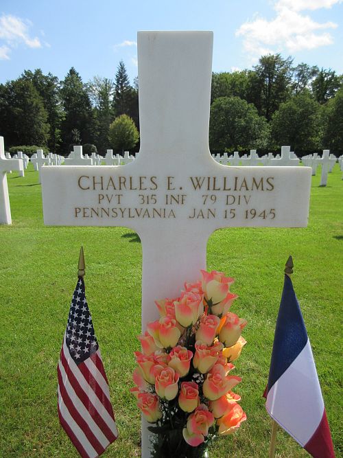 Pvt Charles E. Williams was employed at the Army Marietta Depot before he enlisted in Harrisburg, Pennsylvania on 12 June 1942. He was sent overseas in May 1944.He was killed by artillery shell fragments.