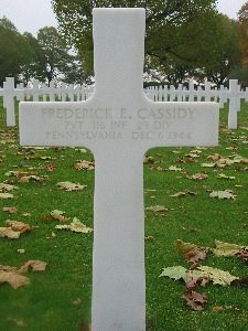 Pvt Frederick E. Cassidy was employed by the Sun Oil Company at Twin Oaks.He enlisted on 15 September 1943 at Fort George G. Meade, Maryland. He joined his unit from a replacement depot on 17 July 1944 and was seriously wounded in action on 8 August 1944. After recovering, he rjoined his unit.