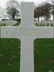 S/Sgt Travis E. Nash attended Grove High School.The airplane had already lost one engine due to mechanical failure when they reached the target. Losing power and altitude, they were soon on their own as the formation pulled ahead. Then they were hit by flak, causing a fire in #2 engine. #3 and #4 engines were smoking and #1 engine had to be feathered.