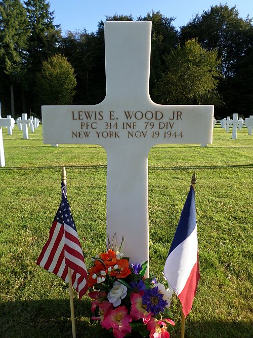 Pfc Lewis E. Wood Jr. attended high school for two years and was a delivery boy at the Grand Union Warrensburg, New York before he enlisted in Albany, New York on 2 July 1943.He was reported seriously wounded in action in France on 15 November 1944, caused by artillery shell fragments in his stomach and buttock and hip. He died four days later.