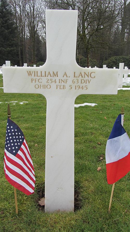 Pfc William A. Lang was employed at the Accurate Plating Company before he enlisted in Cleveland, Ohio on 26 January 1944.He died in a field hospital from wounds caused on 4 February by artillery shell fragments in his chest.