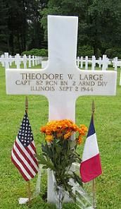 Capt Theodore W. Large was a member of the University of Illinois’ Cavalry Officers Club and the Hoof and Horn club.On 2 September 1944 the 1st platoon of B Company proceeded through Landas where several hundred of the enemy were encountered. The platoon places fire on the enemy and in the ensuing battle, Capt Large was shot in the back by an enemy rifleman, who was hiding in a house in the village at 09.50 h., killing him instantly. The fight continued until 10.40 h. and an undetermined number of the enemy was killed and wounded. The platoon withdrew to evacuated to body of Capt Large.