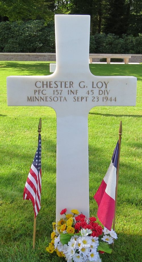 Pfc Chester G. Loy was first buried at the Temporary American Military Cemetery in Saint-Juan, France.Source of information: Peter Schouteten, www.abmc.gov, www.wwiimemorial.com, www.ancestry.com - Headstone and Interment Record / 1930 Census / U.S. WWII Draft Cards Young Men, http://www.45thdivision.org