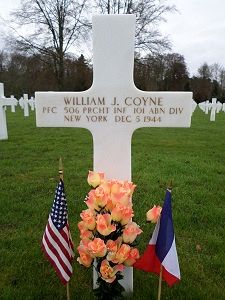 Pfc William J. Coyne was first buried at Temporary American Military Cemetery Solers, France.Source of information: Peter Schouteten, Terry Hirsch, www.abmc.gov, www.wwiimemorial.com, www.ancestry.com - Headstone and Interment Record, www.ww2-airborne.us, 1950 US Census