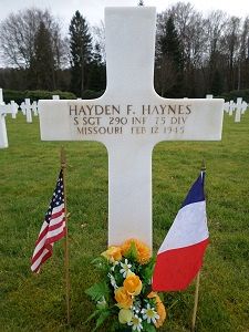 S/Sgt Hayden F. Haynes joined the Regular Army on 20 October 1939. He drowned in France.Source of information: Peter Schouteten, Astrid van Erp, www.abmc.gov, www.wwiimemorial.com, www.archives.gov – WWII Enlistment Record, www.ancestry.com - Headstone and Interment Record, www.newspapers.com - St. Louis Post-Dispatch