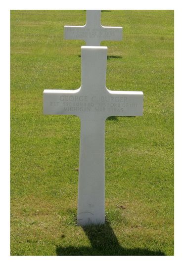 Before completing his high school education at Mackenzie High School, George Burger joined the Air Corps of the U.S. Army Reserve in Selfridge Field, Michigan. Six months prior to his acceptance and his 18th birthday, while continuing his courses of study and flying at the Detroit City Airport and various other flying schools around Detroit, he had over 100 hours logged to his credit. He received his basic training at Jefferson Barracks, then was assigned to the Iowa State College, Cedar Falls, Iowa, and from there was transferred to the Army Air Force training fields at Santa Ana, California, Tulare, California, Minster Field, California, and received his "wings" on 27 June 1944 at Douglas, Arizona. He was the youngest member of Class 44F and was number one in grades and ratings to receive his wings and the Second Lieutenant Commission. His first assignment was that of Pilot Instructor at Bakersfield, California and after two months he volunteerded and requested immediate overseas service. He was sent overseas in October 1944.Due to a serious injury during his youth, he had a partially crippled left hand, but this handicap never stood in his way of anything he went out to accomplish. During his boyhood he spent much of his time designing and developing model planes and was awarded many prizes for his initiative in his field and insired many other young lads in his neighborhood. His lifetime ambition to be able to fly any type of plane had been accomplished - a career he intended to follow at the close of this war.