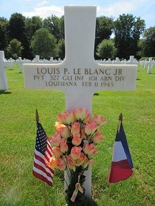 Pvt Le Blanc Jr. enlisted in August 1944 and was sent overseas early in January 1945. He died in France scarcely two weeks after arrival.Source of information: Peter Schouteten, Astrid van Erp, www.abmc.gov, www.wwiimemorial.com, www.ancestry.com - Headstone and Interment Record / 1930 Census, http://www.ww2-airborne.us, www.newspapers.com - The Daily World