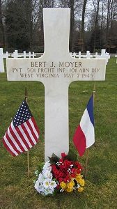 Pvt Bert J. Moyer enlisted in Clarksburg, West Virginia on 16 October 1943.He was awarded the Silver Star Medal. The citation cited: For gallantry in action while serving with the 101st Airborne Division. On 22 December 1944, while his platoon was holding a town in the defenses around Bastogne, Belgium, several wounded men from friendly armored forces were observed to the front struggling to make their way back to the friendly lines. Private Moyer and four comrades were sent to help them. While his group was advancing forward, six of the enemy appeared from nearby woods and moved to a position from where they could cut off the returning wounded. Observing this enemy action, Private Moyer worked his way forward to a concealed position and waited until the enemy were almost upon him. He then opened fire but his rifle jammed several times. Despite this, he killed two of the enemy, wounded two and captured the remaining two. Through the courage, tenacity of purpose, and aggressiveness of Private Moyer the entire group of wounded men were able to return to the safety of friendly lines.