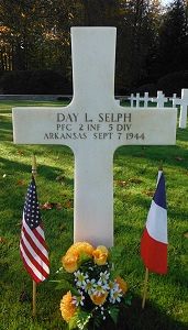 Pfc Day L. Selph worked on a farm before he enlisted at Little Rock, Arkansas on 20 August 1942.He was first buried at the Temporary American Military Cemetery of Champigneul, France.