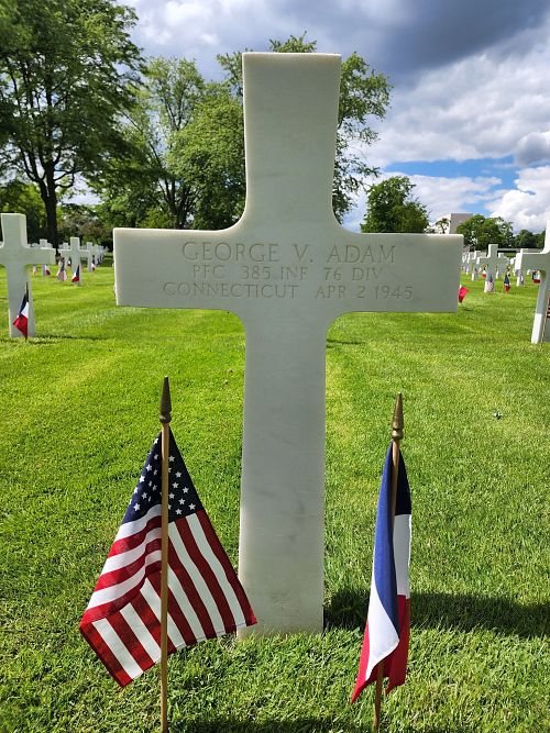 Pfc George V. Adam was a chauffeur before he enlisted in New Haven, Connecticut on 17 December 1943.He was wounded by a gunshot in the chest and died of his wounds.