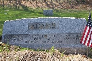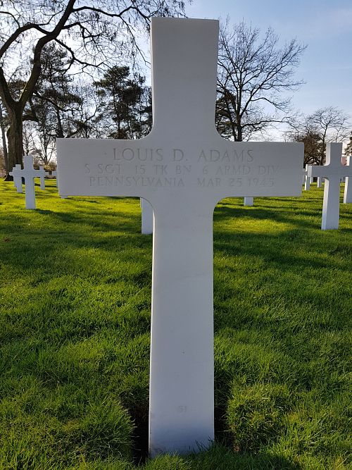 S/Sgt Louis D. Adams attended high school for three years and was a carpenter before he enlisted at Fort George G. Meade, Maryland on 18 March 1942. He was sent overseas in February 1944.He was killed when his tank met enemy anti-tank fire while attempting to cross the Rhine river.