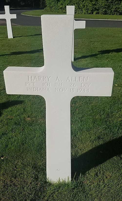 Pvt Harry A. Allen attended high school for four years and was employed at the Centlivre Brewrey before he enlisted in Indianapolis, Indiana on 24 November 1943.He was first buried at the Temporary American Military Cemetery in Limey, France.